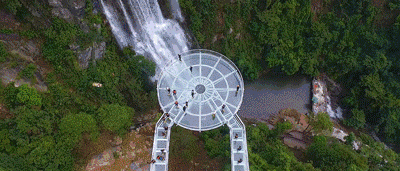 懸空玻璃平臺全長202米,以72米的懸空跨度名列世界第一,為美國科羅拉多大峽谷的U形橋(21米)的3.5倍;點睛之筆是平臺頂部直徑16.8米的玻璃觀景圓臺,這是和瀑布親密接觸的絕佳位置。圓臺中間獨具匠心地設(shè)計了網(wǎng)格狀鏤空,山風穿透,頓生寒意;踏步其上,如墜深淵,令人心驚膽寒。