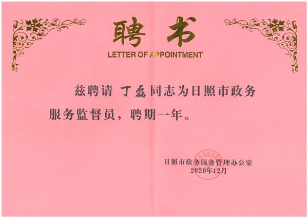 2020年12月3日,日照市政府服務(wù)管理辦公室、日照市行政審批服務(wù)局舉行日照市政務(wù)服務(wù)監(jiān)督員聘任儀式及政府開放日活動,公司董事、行政總監(jiān)丁磊被聘為日照市政務(wù)服務(wù)監(jiān)督員。
